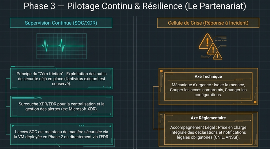- Phase 3: Supervision 24/7, détection des attaques et support technique et organisationnel pour redémarrer très rapidement.